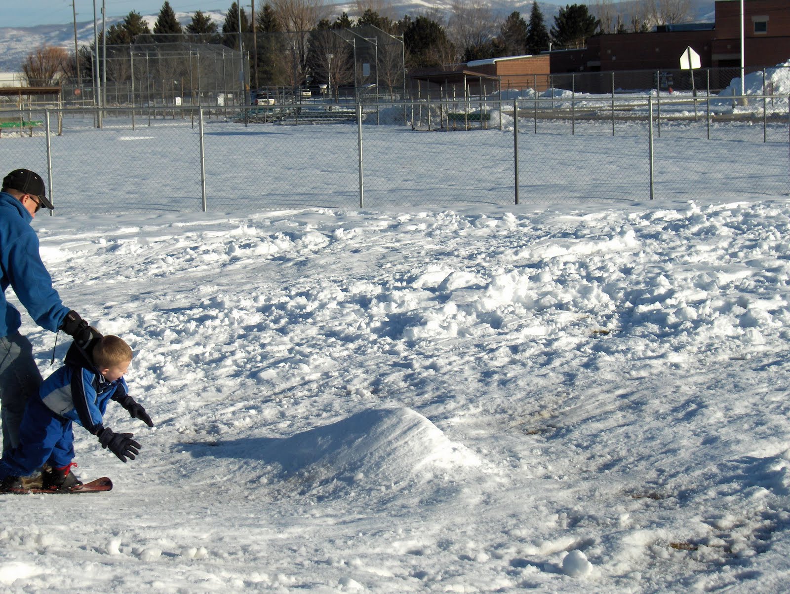 After caroling we went sledding on the hill by the train tracks. We even got to see the train come into the station. The boys had a GREAT time. Even after Clint's crash into the jump which included Darryl's body smashing Clint's head into the jump. At first he wanted to call it quits but I thought we should encourage him to go again so he would remember how much fun he had instead of remembering we left because he got hurt. He wanted to go one more time, but then he wanted to go again and again and we couldn't get them to leave. We had a sled race with a bunch of other people who were on the hill too. As you can see Darryl had the tough job. We finally told them we had to leave. We headed home for hot chocolate and doughnuts. Then we started a new tradition, we made a huge breakfast for dinner-- pancakes, eggs, and bacon. While eating his bacon Kade said, "There's just nothing like eating bacon." He loves it-- go figure. Then we all went to bed early-- we were beat. The boys didn't get a nap so they crashed hard. Darryl and I had done all we needed to for Christmas and so we got to go to bed early too-- wahoo! What a fabulous day!